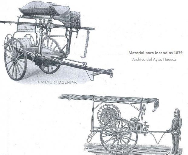 Existe un texto, fechado el 17 de enero de 1861, en el que el Sr. Gobernador recomienda al Ayuntamiento de Huesca la construcción y establecimiento de una o dos bombas contra incendios "/teniendo en cuenta los graves perjuicios que se siguen a los dueños de propiedades urbanas y rústicas con los incendios que por desgracia ocurren con bastante frecuencia/". Estas bombas bien pudieron ser como las que se ofrecían en 1862 en un folleto barcelonés: la bomba Delpech, aspirante e impelente.