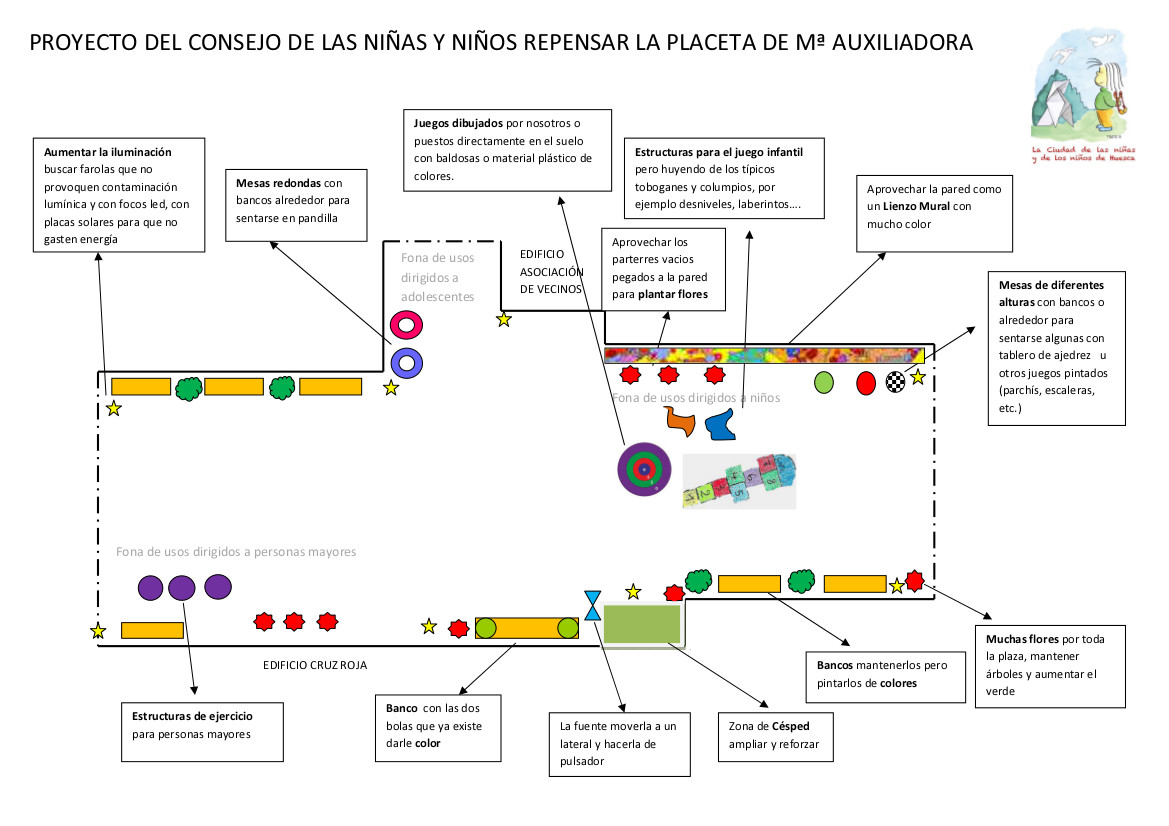 En 2015 se presentó la propuesta definitiva elaborada por el Consejo después de su trabajo de rediseño con reuniones con la Junta del Asociación de Vecinos del Barrio de Mª Auxiliadora, realización de encuestas a personas que pasan por la plaza, medición y realización de un plano a escala, encuentro en la misma placeta con el técnico municipal de Medio Ambiente Fran Bergua para el intercambio de información y perspectivas, preparación y realización de una reunión con los distintos agentes: socios de la Asociación de Vecinos, colegio Salesianos, Cruz Roja, otros vecinos, para la recogida de opiniones e ideas.