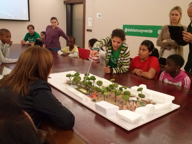 Las niñas y los niños se reúnen alrededor de una maqueta del "Parque del Encuentro"