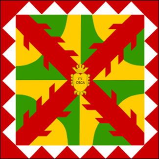 En los siglos XVI y XVII, las Compañías formadas por vecinos de Huesca que el antiguo Concejo reclutaba en caso de guerra o grave peligro salían a campaña llevando ya banderas muy similares a la actual.