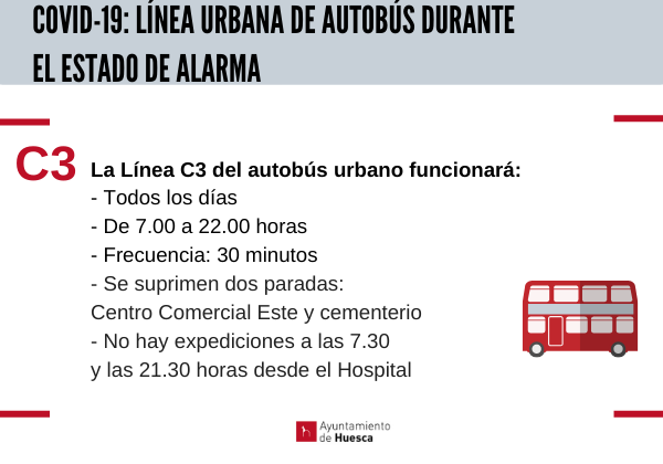 El Ayuntamiento de Huesca, para dar respuesta a las necesidades de los trabajadores del Hospital San Jorge, ha modificado los horarios de dos expediciones de la línea C3 del Servicio de Transporte Urbano, la única que presta servicio durante el Estado de Alarma.
