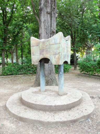 Comentario: La escultura está formada por una caja de música de material refractario, con aspecto de piedra envejecida, asentada sobre dos columnas de hierro. Parece una pieza sencilla pero es complicada, ya que se ha buscado la relación entre forma, sonido y ambiente, jugando con los sentidos y buscando la relación entre la música y las artes plásticas. Se trata de una obra que emite sonidos, realizada pensando en los niños, que la pueden ver como una mariposa o un puente del que tirando de unas varillas sale música (rotas debido a su fragilidad). Esto es posible gracias a un mecanismo simple que incluye campanas, campanillas, tubos sonoros y un platillo de percusión en su interior. La adaptación de estos instrumentos corrió a cargo del músico Julio Casterad.
