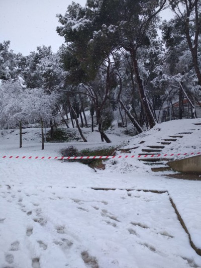 Los equipos de intervención del Plan de Emergencia Municipal de Vialidad Invernal (Pemuvi) del Ayuntamiento de Huesca han decidido esta mañana, tras observar la caída de ramas de árboles por el peso provocado por la acumulación de nieve en sus copas, cerrar por precaución el cerro de San Jorge y la zona arbolada del Hospital Provincial.