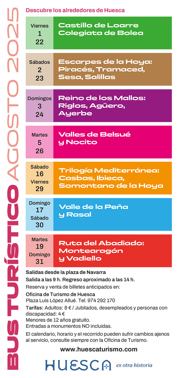 El próximo 1 de agosto arranca una nueva edición del Bus Turístico del Ayuntamiento de Huesca, una iniciativa del Área de Turismo que permitirá descubrir algunos de los paisajes y monumentos más representativos de la comarca de la Hoya de Huesca.