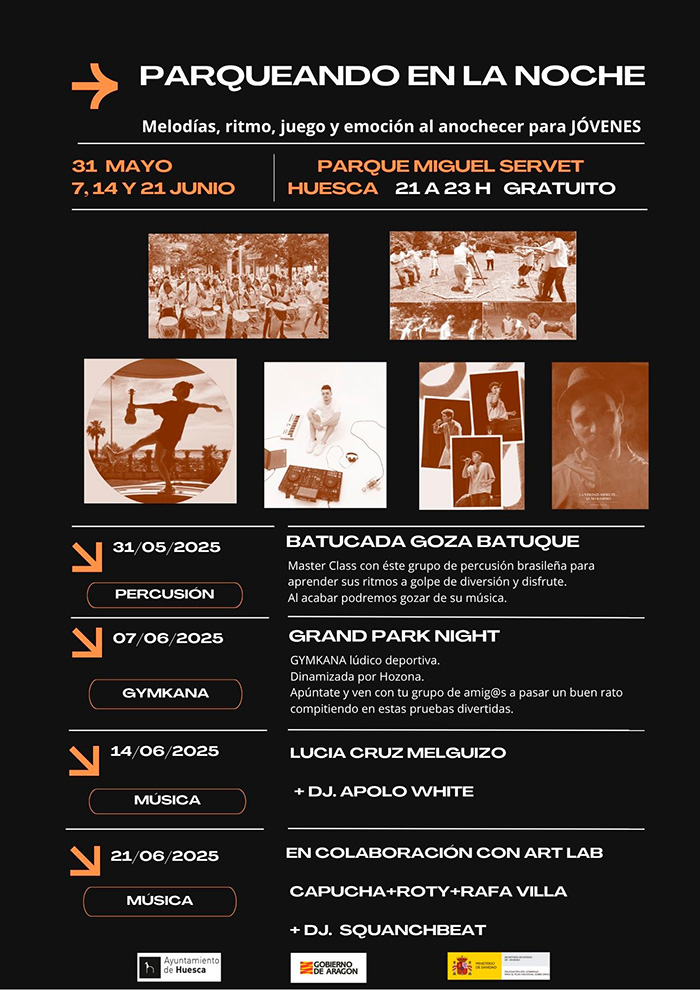 El Área de Juventud del Ayuntamiento de Huesca lanza una nueva propuesta dirigida al público joven bajo el nombre de “Parqueando en la Noche”, un programa lúdico, activo y participativo que llenará el Parque Miguel Servet de música, danza y deporte, en horario de 21:00 a 23:00 horas, durante cuatro sábados consecutivos.