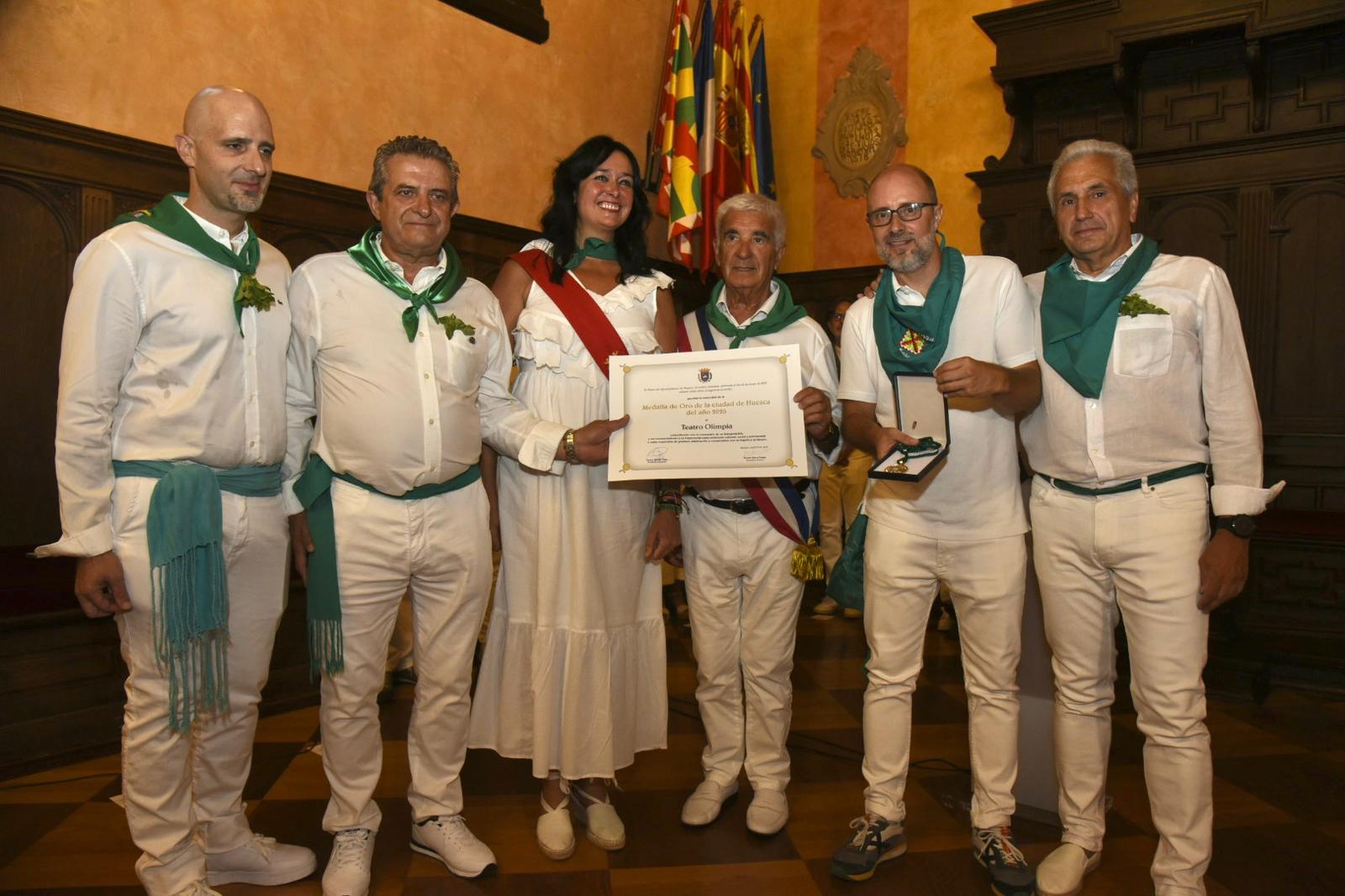 Después, el ayuntamiento ha acogido la recepción oficial a autoridades e invitados. A las 10:45 horas, en el Salón del Justicia, se ha llevado a cabo la lectura del decreto y el acto de entrega de la Medalla de Oro de la Ciudad, que este año ha distinguido al Teatro Olimpia con motivo de su centenario y a la Fundación Ibercaja, en reconocimiento a su dilatada trayectoria de compromiso con el desarrollo social, educativo, cultural y económico de Huesca a lo largo de más de sesenta años.