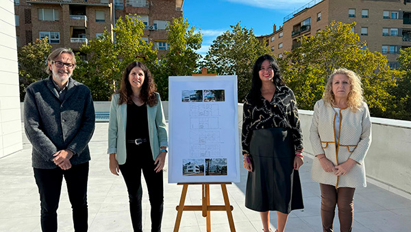 La alcaldesa de Huesca, Lorena Orduna, acompañada del concejal de urbanismo, Iván Rodríguez, la concejal de participación ciudadana, Susana Oliván y la presidenta de CADIS Huesca, Sara Comenge, han presentado esta mañana el que será un nuevo edificio municipal, junto a la residencia de Vitalia, que dará cabida a las diez asociaciones que integran CADIS.