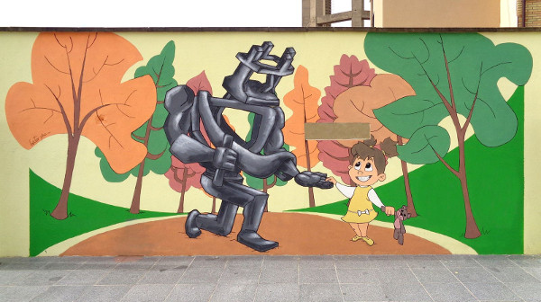 Comentario: En la pintura se ha representado a la escultura urbana dedicada a los Reyes de Aragón, que se encuentra en una de las entradas del Parque Miguel Servet, dando la mano a una niña pequeña a forma de confianza y acogida. Al fondo el parque aparece representado en un estilo esquemático. La idea según su autor, muy aficionado a la historia, era plasmar algo representativo y simbólico de Huesca ya que esta escultura es de los monumentos más conocidos entre los oscenses. Para el retrato de la niña el autor se ha inspirado en su propia hija.