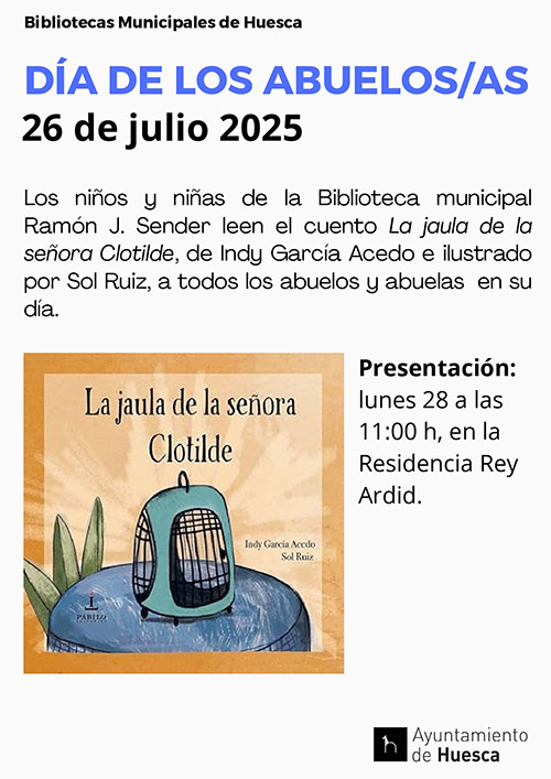 Para conmemorar esta fecha, los niños y niñas de la biblioteca han grabado una narración del cuento “La jaula de la señora Clotilde”, escrito por Indy García, autora almeriense afincada en Huesca, e ilustrado por Sol Ruiz. Esta grabación será enviada a todas las residencias y centros de día de la ciudad para su proyección entre los mayores.