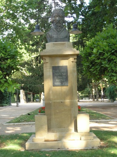 Materiales: Busto de bronce Pedestal en piedra arenisca, acompañado de pequeñas pilastras en forma de chaflanes exentos en las esquinas inferiores. Lo flanquean a cada lado un pequeño laurel.