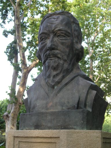 Comentario: Para el modelado de la efigie de Servet se inspiró, con desigual resultado, en el grabado de Cristoffet van Sichem, del siglo XVII, que se conserva en la Biblioteca Nacional de París y ha sido reproducido en numerosas ocasiones.