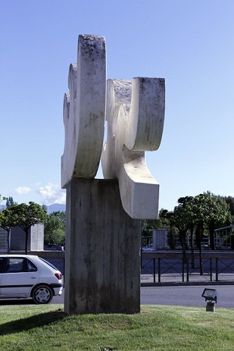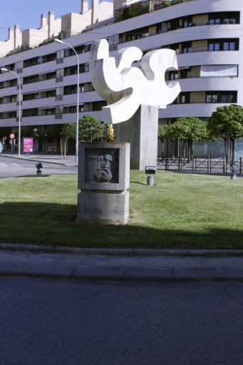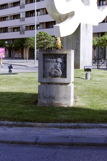Comentario: Los signos en el agua es el nombre que se ha utilizado en ocasiones para designar esta pieza cuya primera ubicación fue el conocido como “puente del Isuela” en la salida de Huesca hacia Barbastro. La pieza forma parte de un momento en que el trabajo como escultor de Sauras se concreta en una serie de monumentos de notables proporciones a lo largo de la geografía del norte de la península. Juega el escultor con el cemento, la piedra y el bronce para componer un doble pedestal. El mayor soporta la doble pieza ondulada que respondería a la denominación que se ha indicado y el menor alberga el bronce con la imagen de un Costa interpretado desde alguna de las representaciones pictóricas del polígrafo altoaragonés y dotado del sello personal y contundente que recorre los dibujos del escultor.