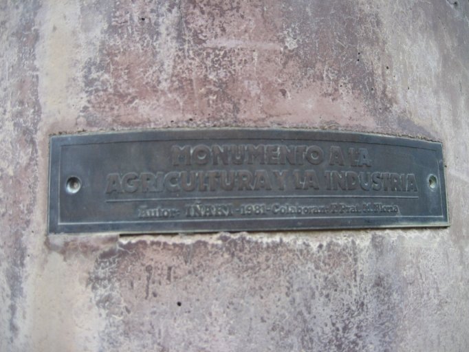 Crónica: En el año 1981 se consigna en la documentación municipal una nota de agradecimiento del Ayuntamiento oscense al Banco de Huesca. En dicha nota se registra que el monumento dedicado a la Agricultura y la Industria es una donación al consistorio oscense por parte de la entidad bancaria cuyo director, en ese momento era Ramón Lloret Huguet. La donación de la obra se hizo con motivo del centenario de la entidad bancaria en la ciudad “perpetuando, de este modo, la estrecha ligazón de esa entidad con los intereses oscenses representados, esta vez, en esas dos vertientes tan nuestras como son la rama agrícola y la industrial”. Se decide instalar la obra en una de las jardineras de la recién urbanizada avenida Martínez de Velasco que la prensa de la época calificó como “una de las avenidas más moderna y señoriales que tiene la capital”. La documentación no menciona al escultor pero en el pie de la escultura se puede leer que el autor responde al nombre de Iñaki y como colaboradores a P. Prat y N. Floria. En el diario La Nueva España se recoge el día 22 de abril del año 1981 que al día siguiente, coincidiendo con la festividad de San Jorge, patrón de Aragón, a las 13 horas sería inaugurado y bendecido el monumento.