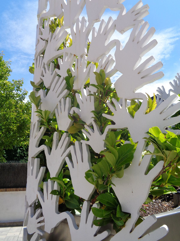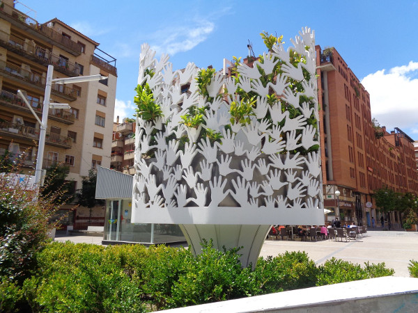 Comentario: Para la elaboración de la escultura se pidió a algunos familiares de víctimas del terrorismo de ETA que estampasen las huellas de sus manos sobre papel. A partir de estos perfiles se elabora el monumento. Una estructura de tres metros de largo abraza un macetero en sus dos terceras partes, en la que se ha plantado un laurel. La parte delantera y central del monumento la ocupa una placa de 105,5 cm de anchura. La estructura se ha colocado sobre una peana también de hierro pintada en blanco, en forma de cono invertido y decorada con acanaladuras simétricas. La simbología de las manos blancas está en la memoria colectiva: corresponde a aquellos terribles días en que toda la ciudadanía salió a la calle a pedir la liberación de Miguel Ángel Blanco con las manos pintadas de blanco como un símbolo de paz y de petición de cese de la violencia. Ese día marcó un antes y un después en el final de la banda ETA. Del centro del monumento (plantado en un macetero y oculto por el mimo monolito) sobresale un laurel, como símbolo de reconocimiento de aquellos, que cómo auténticos héroes han dado su vida víctimas del terrorismo español.