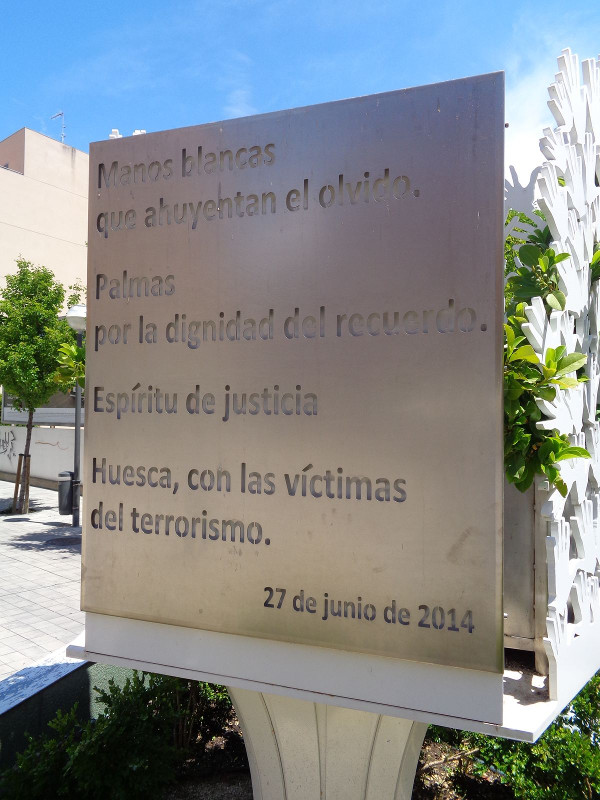 Crónica: El 27 de Junio de 2014 a las 19,30, siendo el día dedicado a las Víctimas del Terrorismo (en esa fecha de 1960 ETA cometió su primer atentado en España), la alcaldesa Ana Alós inauguró, en compañía de numerosas autoridades civiles y militares, el monolito A las victimas del terrorismo de la plaza San Antonio de Huesca. La escultura está compuesta de unas palmas de mano en relieve, en alusión a las "manos blancas" tras el asesinato de Miguel Ángel Blanco. Representan la solidaridad, el recuerdo y la petición de justicia. El texto de la inscripción fue redactado por Javier García Antón, director de Diario del Altoaragón.