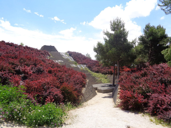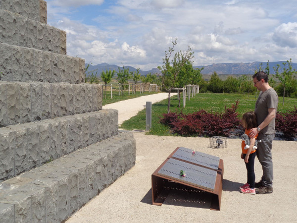 Comentario: El conjunto monumental consiste en 545 prismas de piedra caliza muy oscura, casi negra, proveniente de Fiscal y cortada a cizalla dejando su perfil tan irregular como lo deja el instrumento. Con este material se ha construido una pirámide que no termina como sucede tradicionalmente en punta, sino que se encuentra sin acabar, truncada. Cada una de las piedras representa a un caído oscense republicano, en un recuerdo a los muertos que dieron su vida en defensa de la libertad entre los años 1936 y 1945. La forma de pirámide se ha utilizado por corresponder a la forma atávica que se ha asociado históricamente a un monumento funerario. En este caso, se encuentra sin terminar como símbolo de "muchas familias y vidas que se vieron truncadas” (palabras de Pedro La Fuente). El monumento debe ser entendido en su contexto espacial en el parque, ya que parte de un espacio troncopiramidal invertido, “un vacío”, a través del cual se sube la ladera mediante gradas, hasta esta construcción que corona el cerro. Así se simboliza el tiempo que estas personas se encontraron enterradas bajo tierra y acalladas por nuestra historia, para resurgir después, y ser reconocidos por la historia oscense, devolviéndolos a su lugar y dignificándolas. El monumento con su forma racional, su geometría cuadrada y su orden medido, devuelven los fallecidos de una ausencia largamente silenciada. Desde allí se puede contemplar, con una mirada limpia y nueva, toda la ciudad, como la obra colectiva que es, y también su entorno natural. El monumento se ha rodeado de la planta Agracejo rojo, Agracejo púrpura o Atropurpurea cuyo color rojo es símbolo de violencia. El interior de la pirámide monumental se ha aprovechado para emplazar un aljibe de 8.500 litros para regar por goteo el parque. También se han instalado allí, las bombas y cuadros eléctricos necesarios para el alumbrado y el riego. Sobre el monumento se encuentra emplazado uno de los sensores de lluvia.