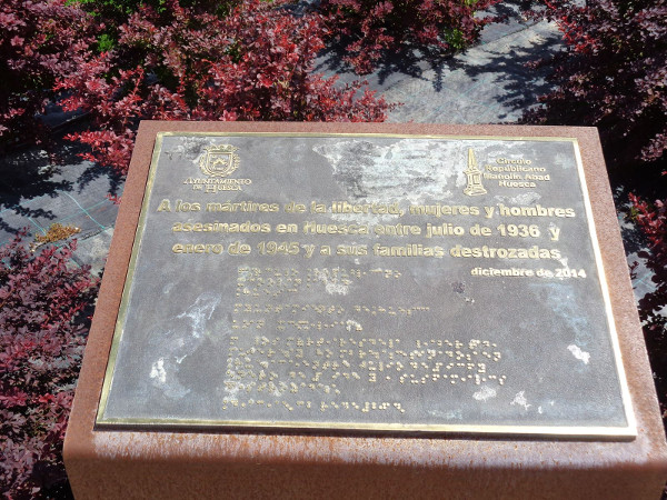 Inscripciones: El monumento tiene alrededor, en cada uno de los lados cuatro placas dobles de acero inoxidable sobre estructura de hierro con pátina oxidada donde se puede leer de forma cronológica los nombres de los fallecidos. Además de estas dos placas hay otras dos en bronce sobre estructuras similares de mayor altura. En la primera, aparece junto a el logotipo del Ayuntamiento de Huesca y el del Círculo Republicano Manolín Abad Huesca, el texto: “A los mártires de la libertad, mujeres y hombres asesinados en Huesca entre Julio de 1936 y Enero de 1945 y a sus familias destrozadas. Diciembre de 2014.” Debajo el texto se encuentra escrito también en Braille. La segunda placa, de las mismas características de la primera, tiene en su parte superior el logotipo de la CNT y reza: “En recuerdo de todos los antifascistas, hombres y mujeres que sufrieron la represión, la guerra, la cárcel, el exilio y la muerte, para que su vida, lucha y ejemplo no caigan en el olvido. Huesca 14 de Diciembre de 2014” El texto también se puede leer en Braille.