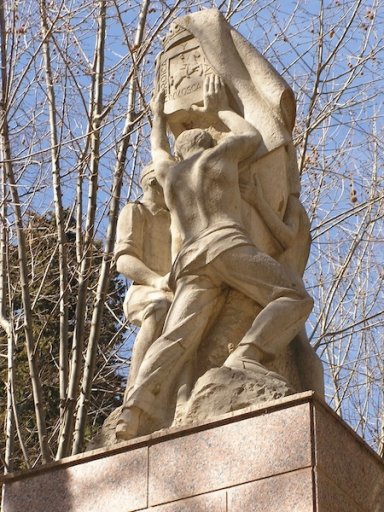 Comentario: La escultura es un bloque del que sobresalen en altorrelieve cuatro figuras masculinas que sostienen el escudo de Huesca y una bandera: un soldado con uniforme militar, otro con boina marcial pero con el torso desnudo, un tercer hombre que lleva pantalón y faja, y un cuarto más joven totalmente desnudo. Al parecer, uno representaba al Ejército, otro a la Falange, otro a los hombres civiles, y otro a la Juventud. Todos los personajes aparecen de espaldas, realzando así su carácter anónimo y alegórico, en un gesto de unión patriótica alzando la bandera, comparable al del Memorial en honor del Cuerpo de Marines erigido en Washington DF en 1954. Bastó una pequeña reforma del monumento para convertirlo exitosamente en un recuerdo a todos los caídos en la guerra, sin diferenciación política. El efecto de masas de la composición se beneficia de la variación entre ropajes y desnudos, así como del dinamismo que unifica la escena.