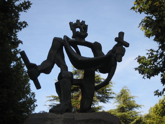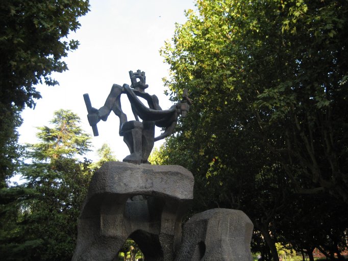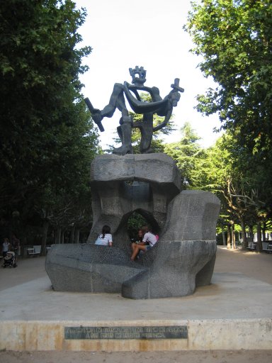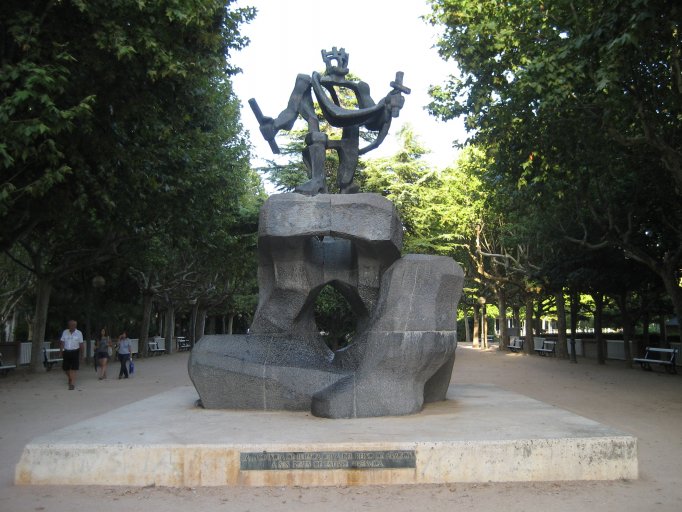 Crónica: “Monumento a los Reyes Aragoneses” una obra de César Montaña que fue realizada por iniciativa de la entonces Caja de Ahorros de Zaragoza, Aragón y Rioja (hoy conocida como Ibercaja, que financió esta escultura datada en 1976). Forma parte de los monumentos públicos que, de manera dispersa, copan el parque Miguel Servet de Huesca. Su estratégica ubicación en una de las entradas del parque hace que todos los niños oscenses se hayan deslizado alguna vez durante su infancia por las sinuosas formas de piedra que constituyen la base del monumento como atestugua el desgaste y brillo de la piedra.