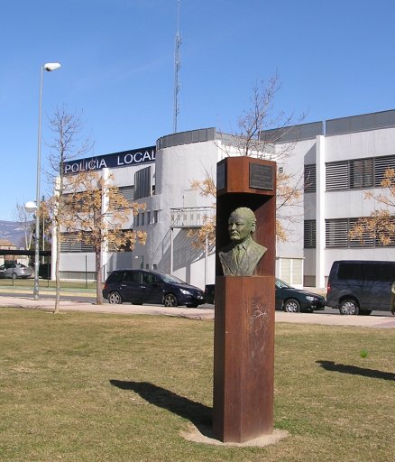 Comentario: La escultura es un sencillo busto de carácter realista, que visto de cerca permite constatar los detalles expresivos del trabajo de modelado. Es muy afortunado el contraste cromático con el acero cortén oxidado, sobre cuya geometría resalta muy bien la escultura. Puede considerarse una solución derivada del monumento al líder socialista Ramón Rubial en Santurce, que había realizado Pepe Noja en 2002, pues también allí se inscribe el busto en bronce del retratado en el ventanal de un alto prisma de acero cortén, aunque en ese caso sobre planta triangular.