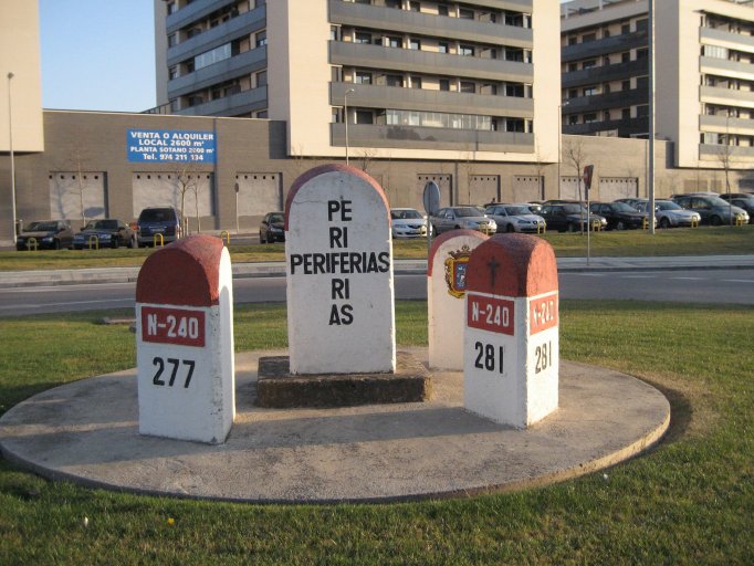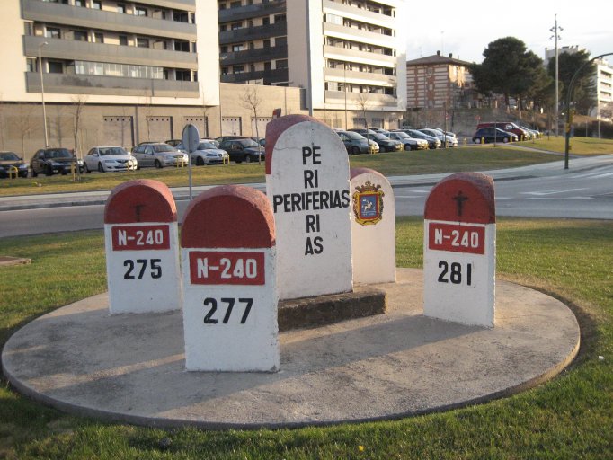 Comentario: La exploración de los nuevos espacios de creación es el lema del festival multidisciplinar oscense Periferias y, sin duda alguna, el diseño del cartel de su edición de 2001 es un claro ejemplo de ello. Éste, obra del madrileño Isidro Ferrer, se configuraba a partir de cinco mojones de la carretera nacional N-240, concretamente los correspondientes a los puntos kilométricos 273, 275, 277, 280 y 281. Un claro ejemplo de ornamentación de las rotondas de los puntos de acceso a la ciudad con ingenio y bajo presupuesto en un conjunto que, por otro lado, se distancia del mero monumento in memoriam aunque tampoco coincide plenamente con el trabajo gráfico de Isidro Ferrer, sino que es más bien una libre interpretación de conceptos y aspecto estético.