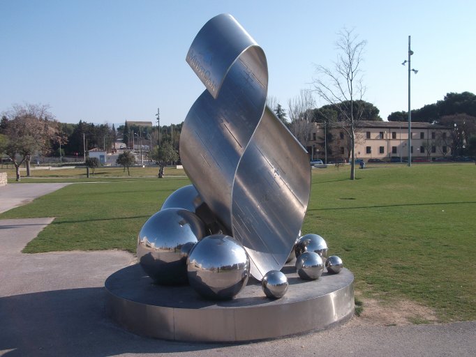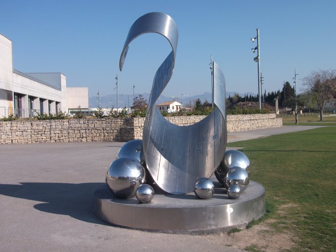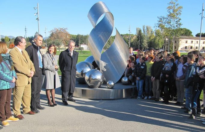 Comentario: Onda de Sol es un reloj solar escultórico, una “escultura solar”, un instrumento científico que es reflejo de nuestro Universo y a la vez una obra artística en toda regla debido a su cuidado diseño y sus indudables valores plásticos, que son complementarios a los estrictamente prácticos vinculados a su condición de reloj. Su autor, Juan Antonio Ros, decidió que se hiciera en acero inoxidable al igual que otros relojes solares monumentales concebidos previamente por él, como el Reloj Solar de la Noria (2008), Helios y Selene (2009) y el Reloj Solar del Centro de Urbanismo Sostenible (2010), los tres en Zaragoza, o el Reloj Solar Tamoser, ubicado en Sabiñánigo. Según Ros, la elección de este material en el caso del reloj oscense se debió a dos motivos principales: su fácil mantenimiento y la voluntad de vincular la obra con el planeta Tierra, cuyo núcleo es hierro fundido. Además, el acero inoxidable permite jugar con los brillos y destellos cambiantes que los rayos del sol provocan sobre la pieza, lo que a su vez sirve para sugerir de manera muy lograda su vinculación con el astro rey. La obra se compone de una gruesa plancha de acero inoxidable de anchura variable, que describe una caprichosa y estilizada forma ondulante cercana a una “S” y que va acompañada en su parte inferior por ocho esferas de distintos tamaños y acabado muy pulimentado. Según el autor, la obra tiene un contenido simbólico-alegórico alusivo al sol ya que, además de ser un reloj solar y estar hecha en un material brillante que refleja la luz, todos sus elementos aluden al astro rey. Así, por un lado, la gran plancha ondulante pretende simbolizar una “onda”, es decir, los rayos del sol, que proporcionan la vida y la energía a la Tierra. Por otro, las ocho esferas representan a los ocho planetas del Sistema Solar (el noveno, Plutón, se considera desde 2006 un planeta enano y fue excluido de la lista), es decir, a aquellos que son bañados por los rayos solares, aunque sólo en la Tierra se da el milagro de la existencia gracias a un equilibrio natural que es necesario respetar. De hecho, la obra invita también, según el propio Ros, al conocimiento y reflexión sobre aspectos esenciales de nuestra sociedad como el respeto a la naturaleza, el desarrollo sostenible o las energías limpias. La gran plancha de forma ondulante no sólo tiene una función estética y simbólica, sino que actúa como dial horario del reloj solar, ya que incluye en relieve sobre su superficie las distintas marcas y números necesarios para calcular la hora, que se puede leer mediante el borde de la sombra que el propio reloj proyecta. Concretamente, Onda de Sol es un reloj doble, ya que por la mañana la lectura de la hora se hace en el dial mayor, es decir, en la parte interior de la “onda”, y por la tarde en el dial menor, situado en la cara exterior. De esta manera, a una hora concreta, el dial de la mañana “se apaga” y entra en uso el de la tarde a través de un armonioso juego de luces y sombras. En ambos diales existen marcas de cinco en cinco minutos, aunque la hora se puede calcular con un detalle de poco más de un minuto.