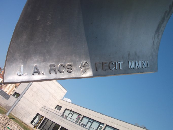Inscripciones: En uno de los extremos de la “onda de sol”, en su cara interior: J. A. ROS FECIT MMXI [acompañado por el símbolo de una rosa en el centro] En la cara exterior del mismo extremo de la “onda de sol”: MULTICAJA [acompañado por el símbolo corporativo de la caja de ahorros en la parte superior] En la cara exterior del otro extremo de la “onda de sol”: HUESCA [acompañado a la izquierda por un caballo esquemático, versión simplificada del escudo de Huesca].