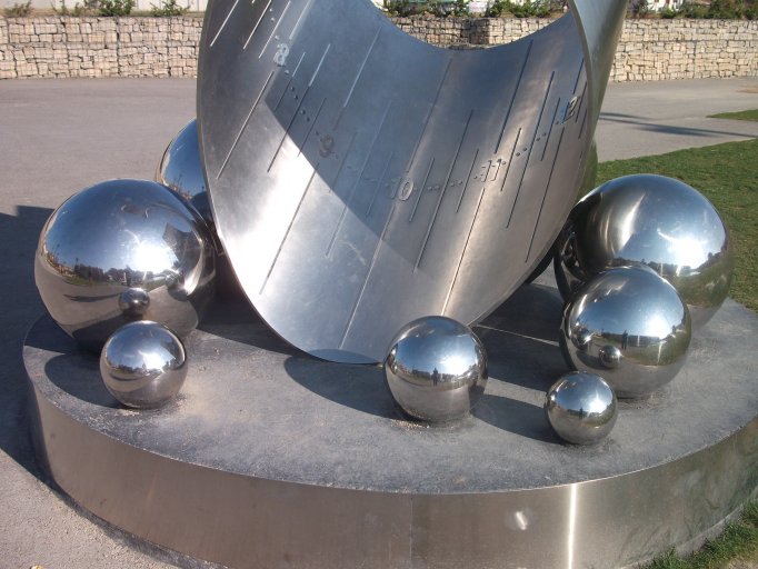 Materiales: Acero inoxidable (el reloj solar en sí) Hormigón (el relleno de la base circular)